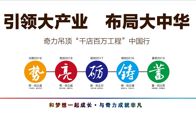 奇力吊頂成立十五年來,始終以穩中求進的發展步驟,推動著行業和自身發展。2015年,奇力推行“大商”之道。以“引領大產業.布局大中華——‘千店百萬工程’中國行”計劃,推動產品、終端、服務、品牌等各項工作,幫助各加盟商在最短的時間擴大銷售規模,提升經營利潤,進而成就“百萬大商之道”。